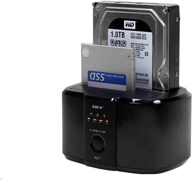 A SKY 16T fiókjaiba dugott merevlemezeket egyetlen USB3-as porton keresztül mountolhatjuk egyszerre a számítógépünkön. Az USB3-as interfésznek köszönhetõen extra gyorsan olvashatunk róluk vagy írhatunk rájuk. A dokkoló különlegessége a blokkszintű másolási funkció. Ha nem csatlakoztatjuk a számítógépünkhöz, akkor az elsõ (A) lemezt egyetlen gombnyomással (CLONE) átmásolhatjuk a másodikra (B). A másolás független a lemez fájlrendszerétõl, mivel a fizikai blokkok és a partíciós tábla 1:1-es másolata fog megszületni a céllemezen. Tehát ha több partíciót tartalmaz a forrás, akkor minden partíció meglesz a cél lemezen is, ha bootolható volt a forrás, akkor az lesz a cél diszk is. Ehhez természetesen az kell, hogy a másolandó lemezzel megegyezõ vagy nagyobb kapacitású legyen a másik HDD/SSD is. A másolási folyamatról az elõlapon 4 LED tájékoztat (25, 50, 75 és 100%-os másolási folyamatot jelezve) –és mindehhez nincs szükség számítógépre se. Ha egy kisebb kapacitású lemezt klónozunk egy nagyobbra (fordítva nem is lehetne), a másolás után a nagyobb lemez ki nem használt területén létrehozhatunk további partíciókat (vagy megfelelõ segédprogrammal átméretezhetõ a másolt partíció), így kihasználható marad annak teljes kapacitása. Magyar nyelvű használati útmutató: //skydigital. hu/dl/SKY16_kezikonyv. pdf
